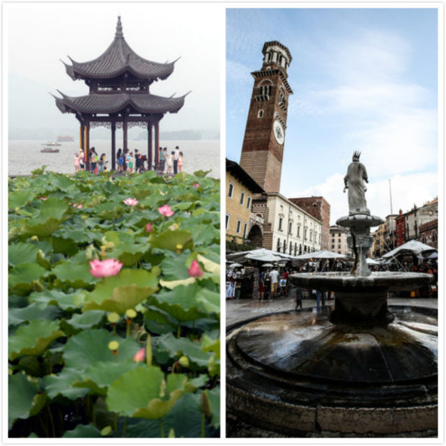 这是一张拼版照片,左为杭州,右为维罗纳。新华社发
