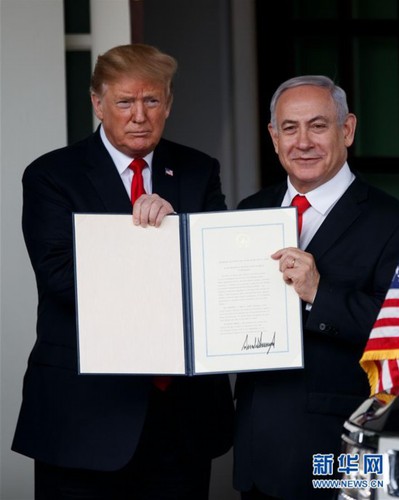 特朗普当天在白宫与到访的以色列总理内塔尼亚胡举行会谈,并签署公告正式承认以色列对戈兰高地的主权。公告称,美方这一决定是因为伊朗和真主党等组织在叙利亚南部采取行动,试图把戈兰高地变成对以色列发动袭击的场所。