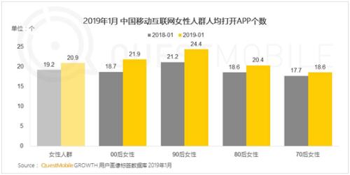 中新网北京3月26日电 移动大数据平台QuestMobile发布最新“她经济”洞察报告显示,截至2019年1月,女性用户人均打开APP个数达21个,高于移动互联网的平均水平,主要为短视频、综合电商、社交等三类。