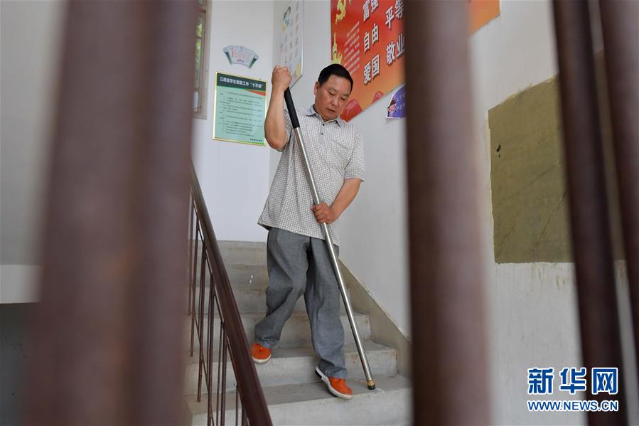 高自仁拄拐下楼梯。因儿时患小儿麻痹,高自仁的腿留下残疾,只能依靠着一根拐杖支撑自己的身体(2018年5月15日摄)。 新华社记者 彭昭之 摄