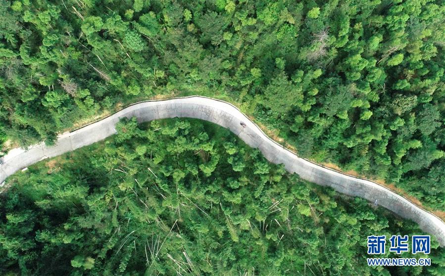 高自仁驾驶助力车行驶在前往梅岭镇立新村立新小学的山路上(2018年9月4日无人机拍摄)。新华社记者 彭昭之 摄