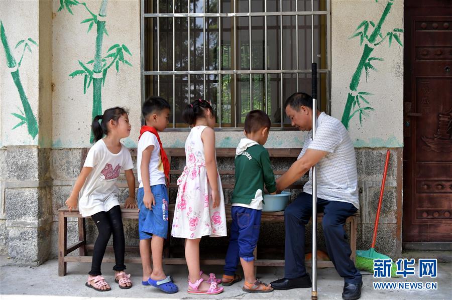 午饭开饭前,高自仁帮助孩子们洗手(2018年9月3日摄)。新华社记者 彭昭之 摄