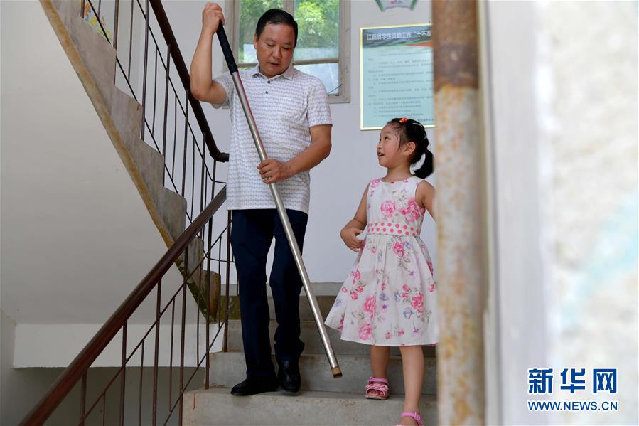 在江西省南昌市湾里区梅岭镇立新村立新小学,乡村教师高自仁正拄着拐杖带着自己的学生下楼(2018年9月3日摄)。 新华社记者 彭昭之 摄