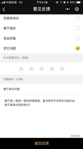 或许作为一位麦当劳的老顾客,突然之间的反差,让他更敏感,“这背景音乐与就餐环境、品牌定位太不搭调”,3月25日中午,吴语一边啃着汉堡,一边打开了微信上麦当劳顾客体验平台,在意见反馈一栏提交了一句“餐厅里一首接着一首的网络歌曲,麦当劳好歹是世界500强企业,能不能换点别的音乐?!?/p>