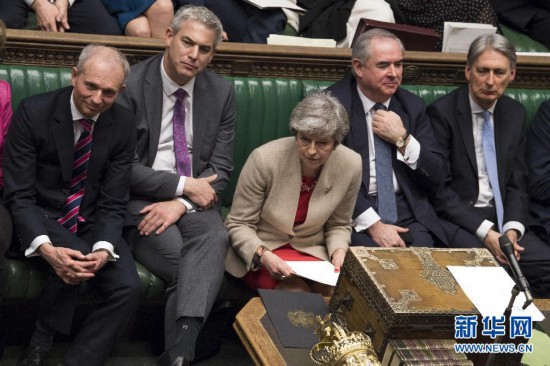 3月29日,在英国伦敦,英国首相特雷莎·梅(中)出席议会下院辩论。 新华社发(英国议会摄影师马克·达菲摄)