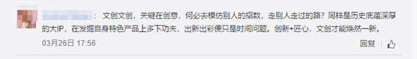 对此,有网友评论称:“文创文创,关键在创意,何必去模仿别人的招数,走别人走过的路?同样是历史底蕴深厚的大IP,在发掘自身特色产品上多下功夫,出新出彩便只是时间问题。创新+匠心,文创才能焕然一新?!?/p>