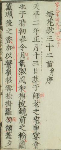 “天平二年正月十三日,萃于帅老之宅,申宴会也,于时,初春令月,气淑风和,梅披镜前之粉,兰薰佩后之香……”