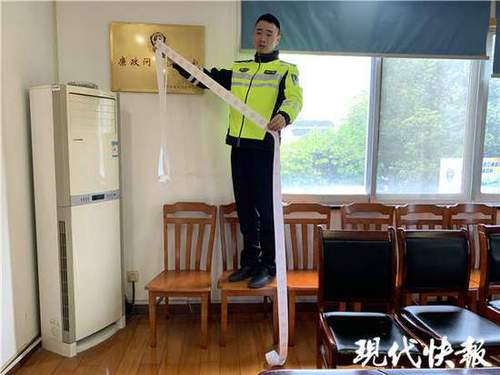 交警站在椅子上都无法将认定书完全拉直。(苏州园区交警供图)