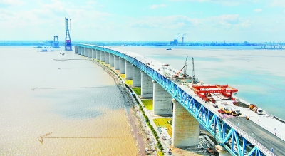 改革开放以来,中国从桥梁大国迈向桥梁强国。图为沪通长江大桥施工现场。新华社发