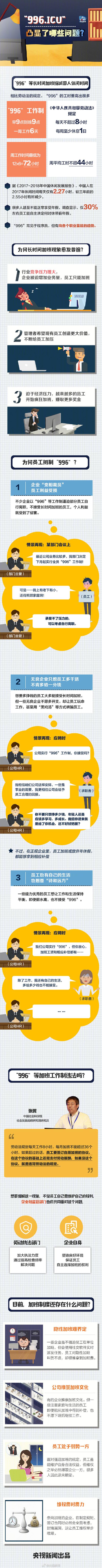 另据@央视新闻【“工作996,生病ICU” 你遭遇过这样的加班吗?】近日,在某代码托管平台上,有人发起“996.ICU”项目以抵制公司的“996”工作制。“996”指员工从上午9点工作到晚上9点,每周工作6天;“ICU”则指员工因长时间工作,易患各种重大疾病,最后直接送进ICU病房?!?96”工作制因何而起?凸显了哪些问题?详解
