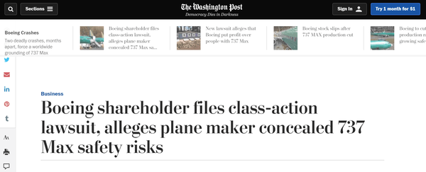 波音股东指控飞机制造商隐瞒737MAX安全风险