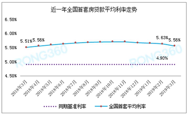 根据融360的监测数据,2019年3月,全国首套房贷平均利率为5.56%,环比下降1.24%,首套平均利率已连降四个月,回归至2018年4月水平。