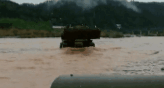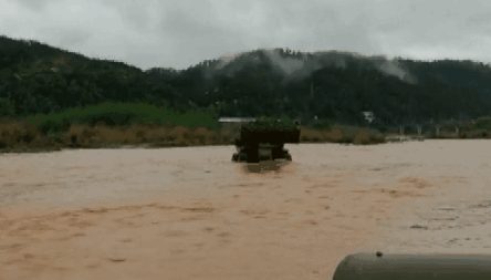 铲车身躯庞大,车轮足足有一人多高,随着铲车在河中慢慢前行,庞大的铲车逐渐消失成为一个小点,最后成功登陆溪屿。