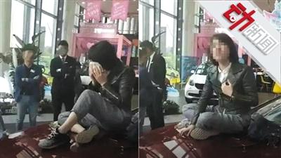 在汽车4S店中,一名女子坐在一辆红色奔驰车引擎盖上,哭诉维权。视频截图