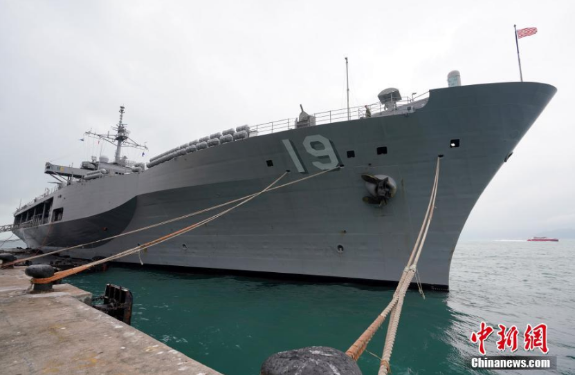 4月20日,美国海军第七舰队旗舰“蓝岭”号两栖指挥舰抵达香港,??吭谡猩叹致胪?。??科诩湔蹈椿罱诩倨?,近千名船员将在香港观光购物和享受美食,舰上乐队还将到香港海洋公园和迪士尼乐园表演?!袄读搿焙帕狡苤富咏⑾虾?9,1970年11月14日正式服役,在两栖作战中,提供海、空、陆综合指挥?!袄读搿焙怕嘏潘?8372吨,舰长194米,宽25米,主甲板宽32.9米,航速23节,舰员编制821人,指挥部人员190人。中新社记者 张炜 摄