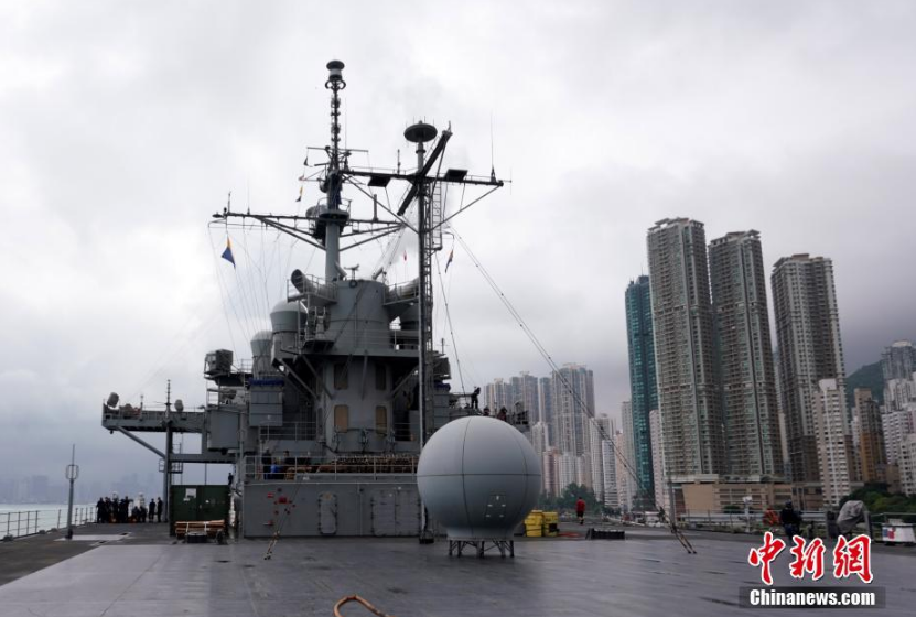 4月20日,美国海军第七舰队旗舰“蓝岭”号两栖指挥舰抵达香港,停靠在招商局码头。??科诩湔蹈椿罱诩倨?,近千名船员将在香港观光购物和享受美食,舰上乐队还将到香港海洋公园和迪士尼乐园表演。图为位于“蓝岭”号两栖指挥舰中部的大型舰岛。中新社记者 张炜 摄
