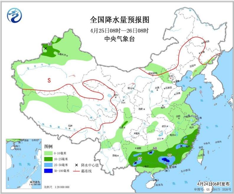 图5 全国降水量预报图(4月24日08时-25日08时)