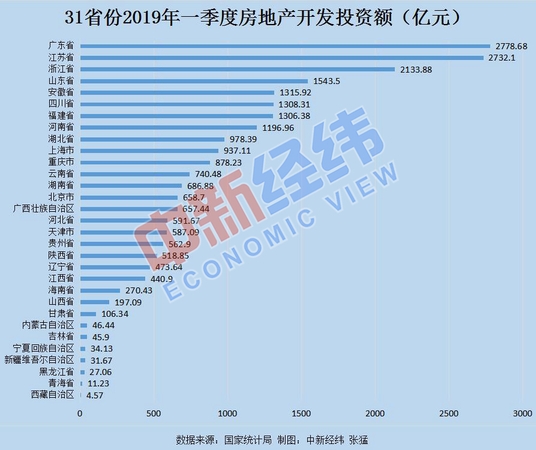 从各省份数据来看,广东房地产开发投资以2778.68亿元位居首位,江苏、浙江紧跟其后。2019年一季度,广东、江苏、浙江房地产开发投资额均超过2000亿大关。