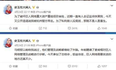 近日史玉柱微博辟谣“被带走”,称“为了破坏巨人网络重大资产重组项目审批,近期一直有人去证监会抹黑我”。