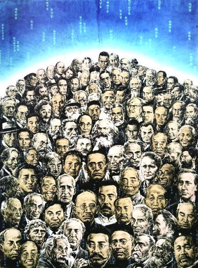 《世纪智者》长252厘米、宽168厘米,是一幅世界人文智者群像图,人类文化方方面面的代表人物出现在同一个画面上,从托尔斯泰、马克思、爱因斯坦到梅兰芳、郭沫若、钱学森……数以百计的头像构成“智者”的星球。这些各个领域的先行者,以整齐的队列密密匝匝占据着画面的五分之四,观众则在仰视中无声地与智者对话,感受着先导者们思想的张力和历史文明的厚重。作品中的后排人物组合形成一条弧形的地平钱,暗示历史的纵深和队列的无尽。人物背后则是刚刚露出鱼肚白的天际和渐次上升的曙青色——这是黎明前浓重的青蓝交混的过渡色彩。此外,在象征了宇宙苍穹的青蓝天际中缀满或隐或现的银色文字——思想家、哲学家、历史学家、教育家等字样,宛若广袤天际中的各类星辰。