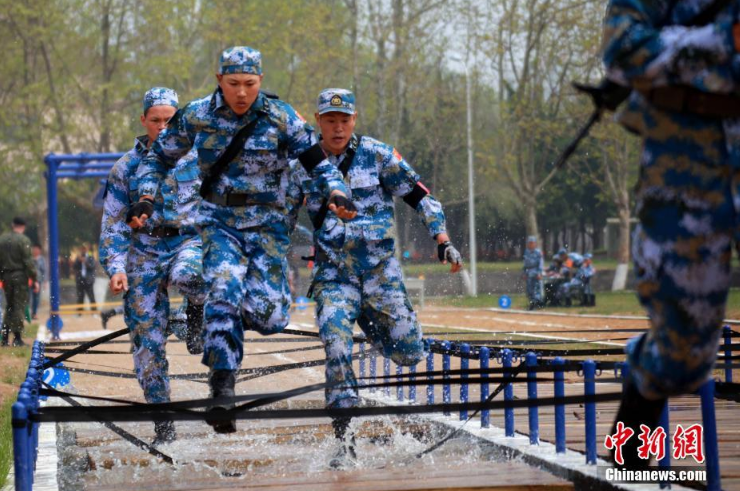 4月30日,中俄“海上联合—2019”军事演习陆战分队军事竞赛在中国海军陆战队某旅举行。图为中方参演陆战队员越过障碍。中新社记者 李纯 摄