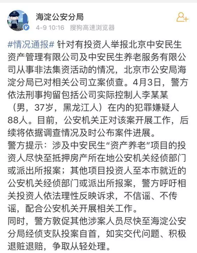“2月底有一笔理财到期后,他们也没有返还本金,这时候就感觉出事了?!绷蹑玫脑じ泻芸毂恢っ魇亲既返?。4月9日,北京市公安局海淀分局官方微博通报称,针对有投资人举报北京中安民生资产管理有限公司及中安民生养老服务有限公司从事非法集资活动的情况,北京市公安局海淀分局已对相关公司立案侦查。