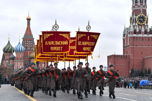 (11月7日红场阅兵中纪念旗入?。?/p>