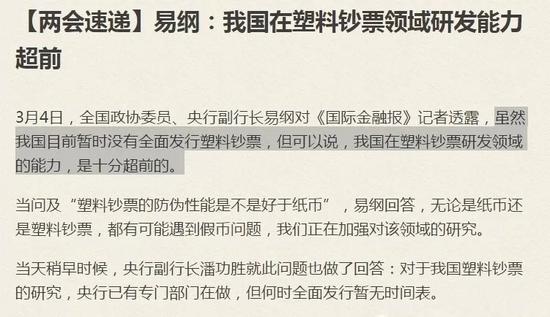 2017年全国政协首次小组会议期间,易纲表示,我国在塑料钞票研发领域的能力,是十分超前的。潘功胜表示,对于我国塑料钞票的研究,央行已有专门部门在做。