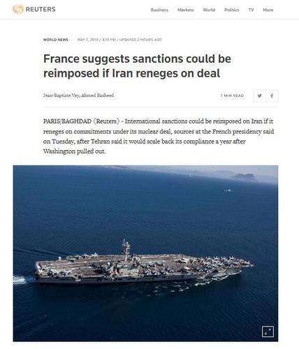 美国航母打击群与B-52战略轰炸机本周开赴波斯湾,压力之下,伊朗媒体7日消息说,预计该国将不再履行伊核协议中的部分承诺。对此,法国政府消息人士7日警告,如果伊朗违背核协议承诺,国际社会可能会重新对其实施制裁。