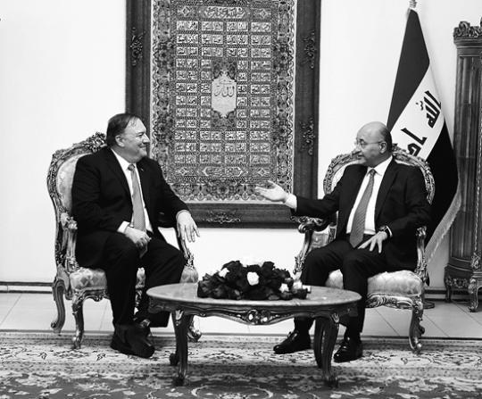当地时间5月7日,伊拉克巴格达,美国国务卿蓬佩奥与伊拉克总理阿迪勒·阿卜杜勒-迈赫迪会面。本来蓬佩奥计划访问德国,却突然以“紧急问题”为由取消了柏林之行,转而访问伊拉克。视觉中国供图