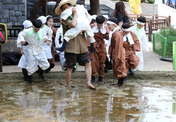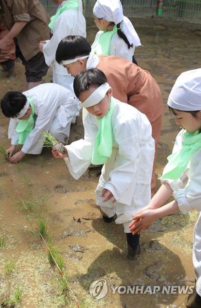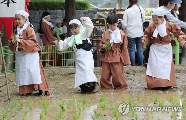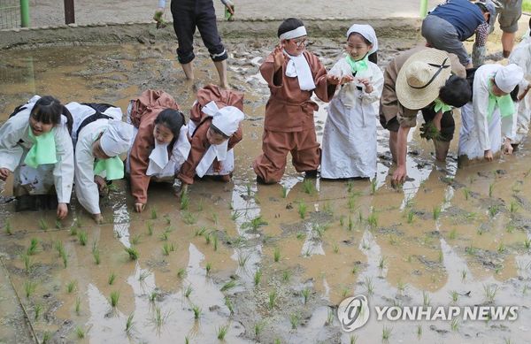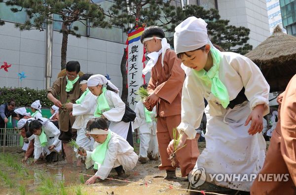 据韩国《中央日报》8日报道,孩子们穿戴成过去韩国农民的样子,跟随馆长一起迈进了泥水中。现场还打出汉字标语“农者天下之大本”。