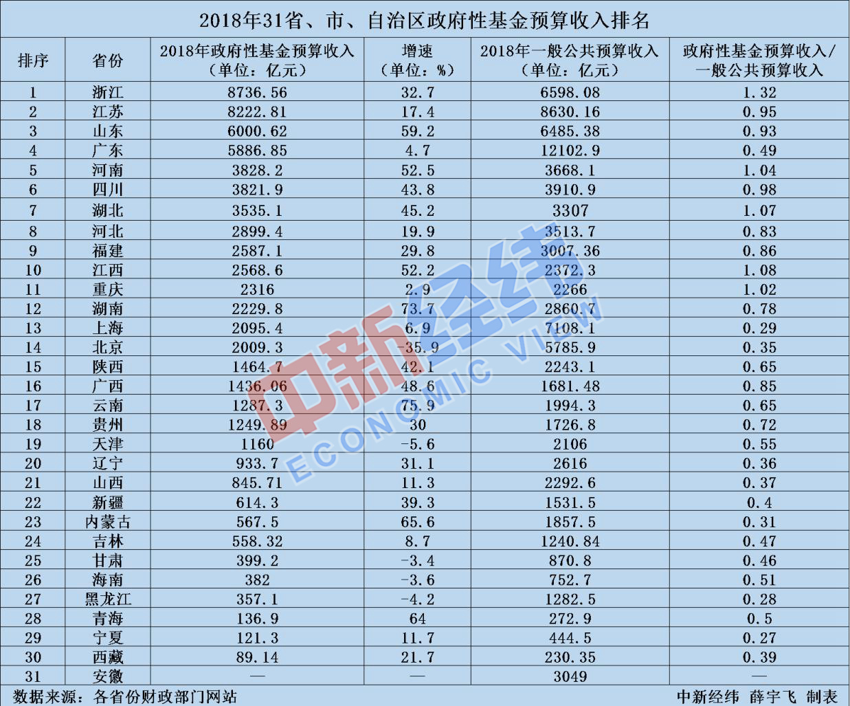 数据显示,各省份的政府性基金预算收入差别较大,在31个省、市、自治区中,浙江、江苏达到了8000亿级,广东为5000亿级,河南、四川、湖北超过3000亿元,河北、福建等7省份为2000亿级,陕西、广西等5地为1000亿级。西藏政府性基金预算收入最低,为89.14亿元。安徽省未公布2018年政府性基金预算收入。