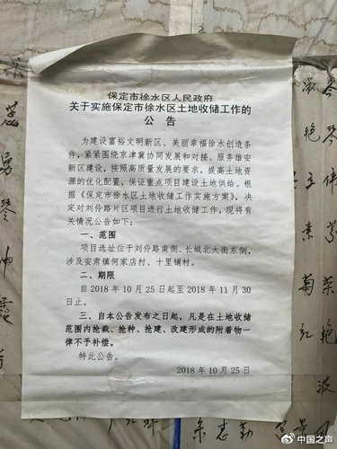 去年10月,保定市徐水区政府一天发布5则土地“收储”公告,称将在一个月内“收储” 17个村庄的耕地,其中包含雄安新区周边管控区的5个村庄。据了解,收储的目的为建设植物园、中小企业园、华讯天谷等项目。但是,“收储”过程中,部分村民对土地“收储”的合法性提出质疑,并称存在强迫签字的现象。
