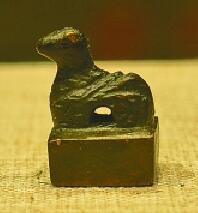 再看另一枚铜印,正方形,通高3.5厘米,边长2.3厘米,纽与印座之间有一个小孔,用于系绶带。印纽为一只绵羊,其头部平视,温顺地蹲卧在铜印上,造型生动逼真。印文文字端庄古朴,字迹清晰,篆文“汉归义羌长”。