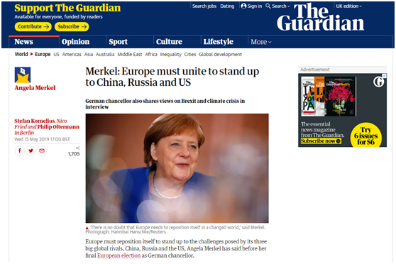 【环球网报道】 “欧洲必须团结起来应对3个全球对手带来的挑战:美国、中国和俄罗斯”,英国《卫报》15日说,这是德国总理默克尔在其最后一次以德国总理身份参与欧洲议会选举时,对欧洲发出的呼吁。