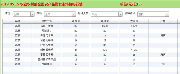 比如5月15日数据中,价格最高的北京八里桥市场荔枝价格为35元每公斤,最便宜的只有7.75元。