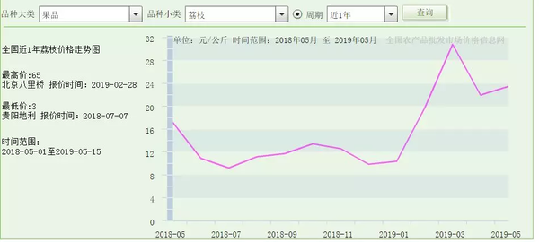而从近一年的数据来看,荔枝价格的高点在2019年2月28日的北京八里桥市场,报价65元每公斤。而最低点则是2019年5月15日贵阳地利市场的报价,仅为3元每公斤。