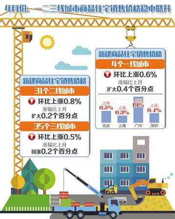 4月份,一线城市新建商品住宅销售价格同比上涨4.7%,涨幅比上月扩大0.5个百分点;二手住宅销售价格上涨0.8%,涨幅扩大0.3个百分点。