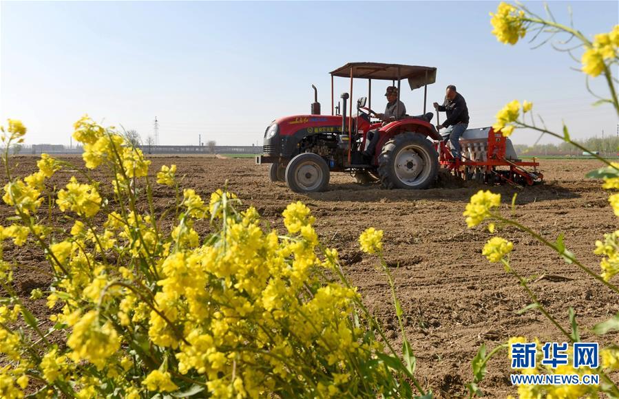 4月7日,河北省南和县三思乡东宋村村民在机械播种中药材。新华社记者 朱旭东 摄
