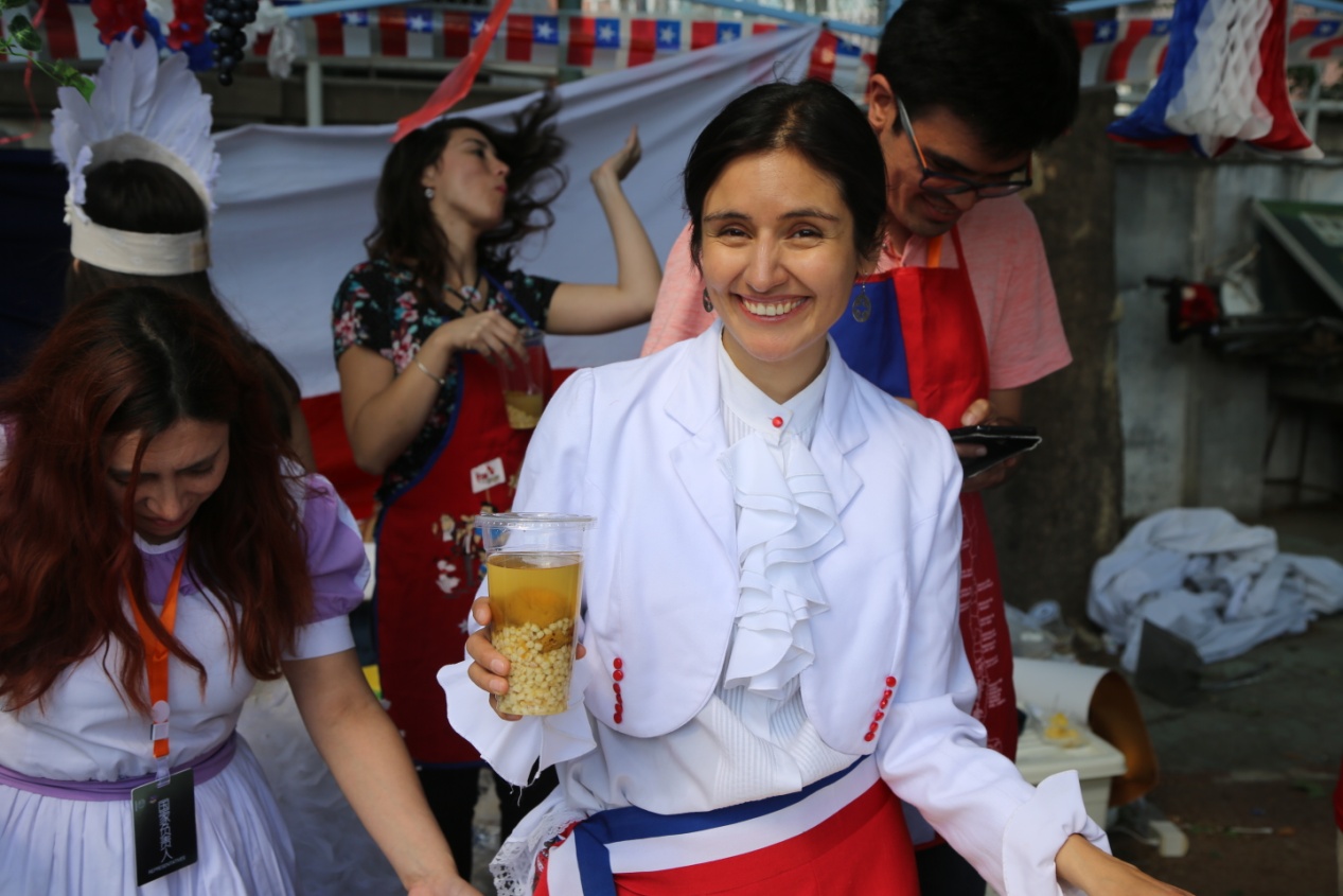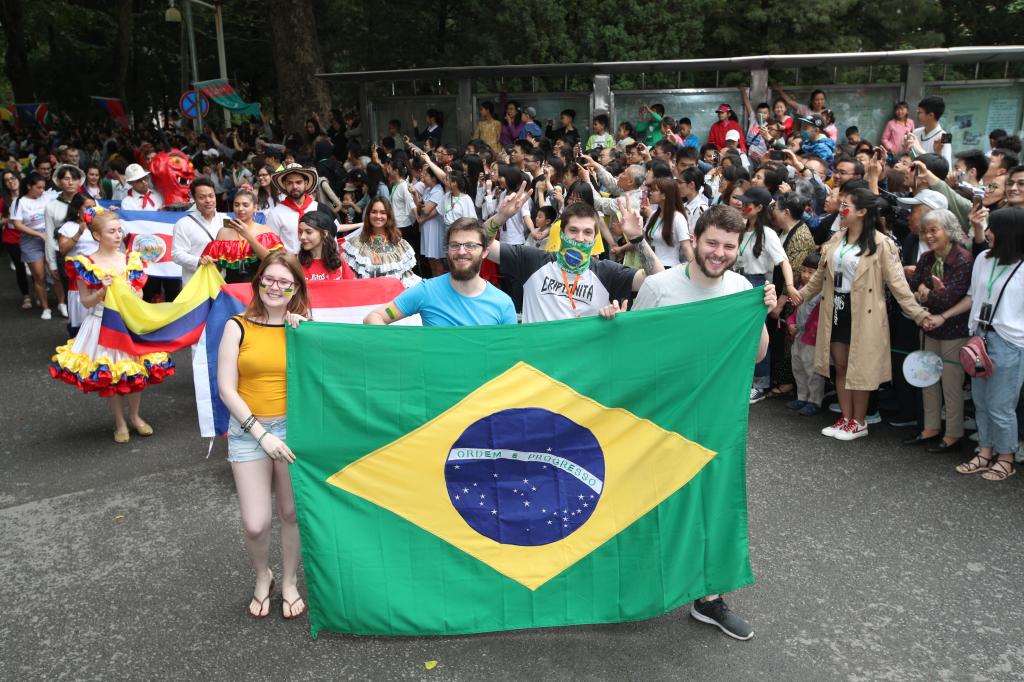 在美洲和大洋洲,热情和笑声不时袭来,巴西小伙子穿上了球衣,手捧冠军奖杯频频与观众合影。加拿大、美国留学生为观众们准备了地道的本国美食,令人垂涎欲滴,不舍离去。