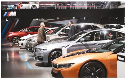 在美国举行的纽约国际汽车展媒体预展上,参观者观看宝马轿车。