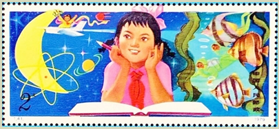 1979年10月3日,为了反映中国少年儿童从小爱科学、学科学的活动,国家邮电部发行《从小爱科学》特种邮票一套6枚,同时发行小开型张一枚,由邮票设计家邹建军设计。小型张图案以茫茫的宇宙和奥秘的大海为背景,是一位长着一双大眼睛的小女孩沉浸在神奇美妙的科学幻想之中。她双目炯炯有神,双手托着下巴,面前放着一本绘画本,右手执着一支铅笔,左手做出计算的样子。在她左边是浩瀚的太空,还有弯月、原子模型、宇宙飞船、人造卫星等;在她右边是蓝色的大海,还有海带、海鱼等海洋生物。