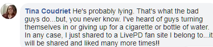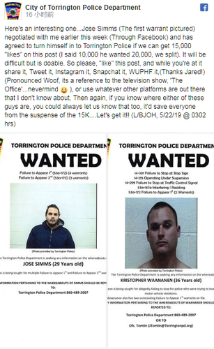 托灵顿警方在推特上表示:“本周早些时候何塞(通过脸书)与我(布雷特·约翰逊少尉)进行谈判,同意向托灵顿警方自首,前提是我们能在本篇帖子上获得15000万个赞(我说1万个赞吧,他说2万个,最后我们取了个平均数)。这将是困难的,但却是可行的。所以,请‘点赞’这篇文章。在推特等社交平台上转发分享。”