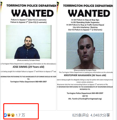 此外,托灵顿警方还表示,如果民众知道何塞和另外一名通缉犯在哪里,请告知警方,将警方从“15000个赞”这种悬念中解救出来。