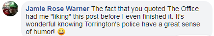 网友Jamie:“了解托灵顿警方有如此棒的幽默感,真好?!?/p>