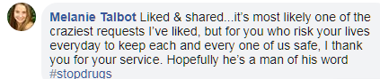 网友Melanie:“点赞分享。这是自己点赞过的最疯狂的要求之一。但是你们(警察)每天都冒着生命危险保证每个人的安全。感谢你们的服务。希望乔斯是一个遵守承诺的人?!?/p>