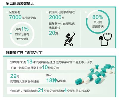 目前,在我国上市且有罕见病适应证的55种药物中,有29种药物纳入国家医保目录,涉及18种罕见病,其中9种药物享受国家医保目录甲类报销,患者使用时无需自付费用。今年3月,我国对首批21个罕见病药品和4个原料药实行减税。降低3%的增值税,同步降低药品价格。一系列利好政策,为罕见病患者打开“希望之门”。