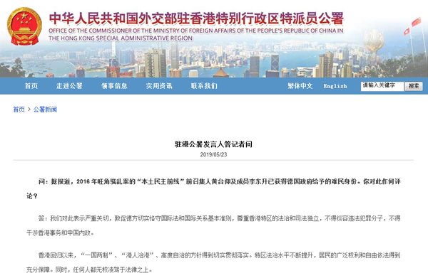 原标题:德国给予两名旺角暴乱头目"难民身份" 驻港公署回应