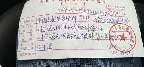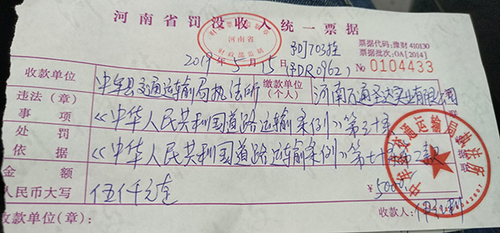 高鹏飞及其跟车司机王强军说,被放行后,他们拿到的唯一凭证是5000元的河南省罚没收入统一票据。他们质疑,整个处罚过程,根本没有《交通违法行为通知书》和《行政处罚决定书》,处罚依据也由超载变成改装货车。
