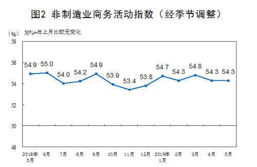 5月份,非制造业商务活动指数为54.3%,与上月持平,表明非制造业总体延续平稳较快的发展势头。